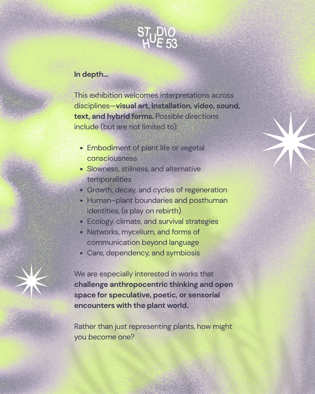 Becoming A Plantcalls artists to create works that explore transformation beyond human—into rooted, slow, entangled forms of life. Becoming a Plant asks you to imagine a shift in perception, time, and being: from movement to stillness, from individuality to interdependence, from voice to silent growth.