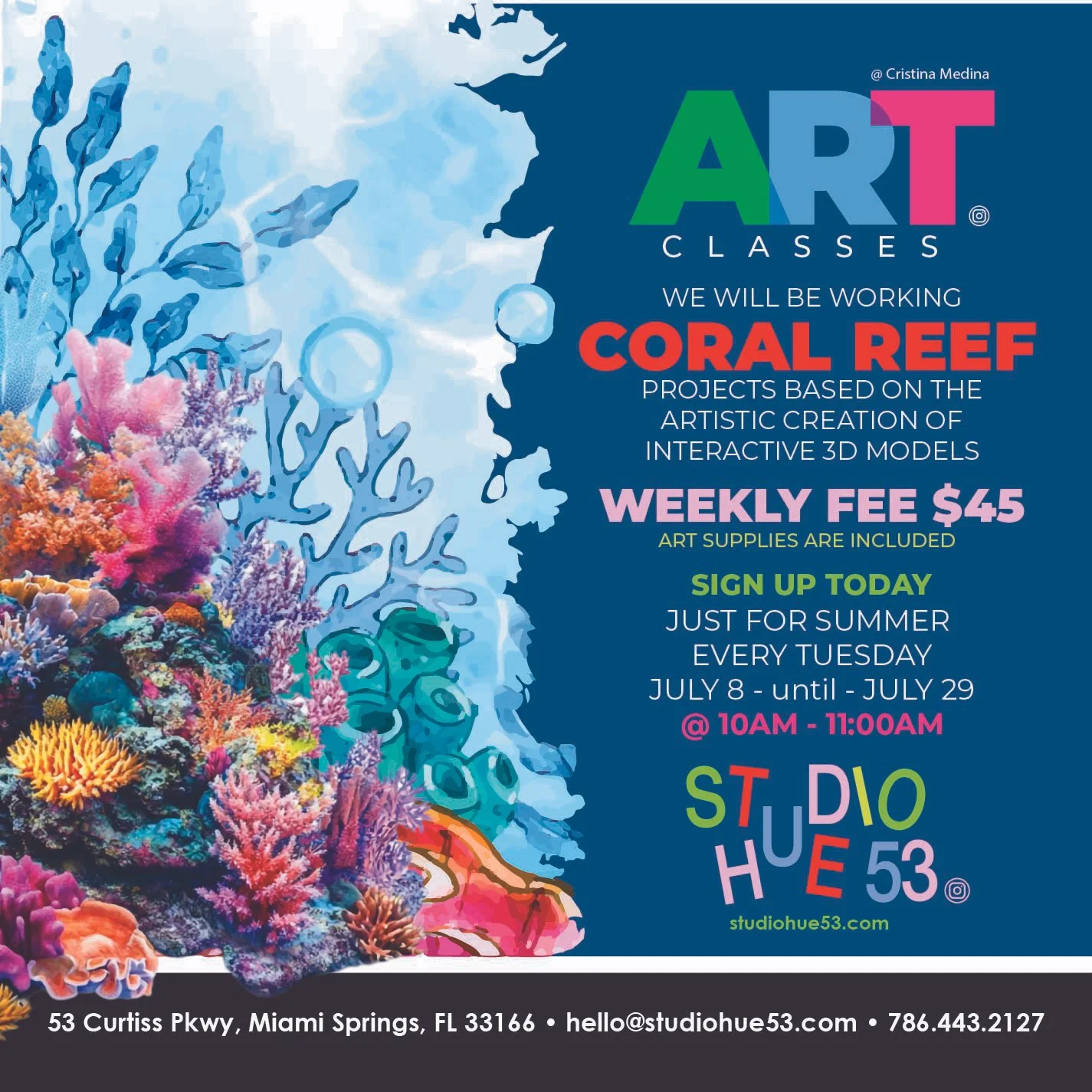 Join Studio Hue 53 for a week of creativity and self-expression at our Art Summer Camp! Led by artists Cristina Medina and Angela Portillo, campers will dive into the world of art through hands-on projects inspired by iconic movements and renowned artists. From painting and design to mixed media and craft, each day offers new ways to explore artistic techniques in a fun, welcoming environment.